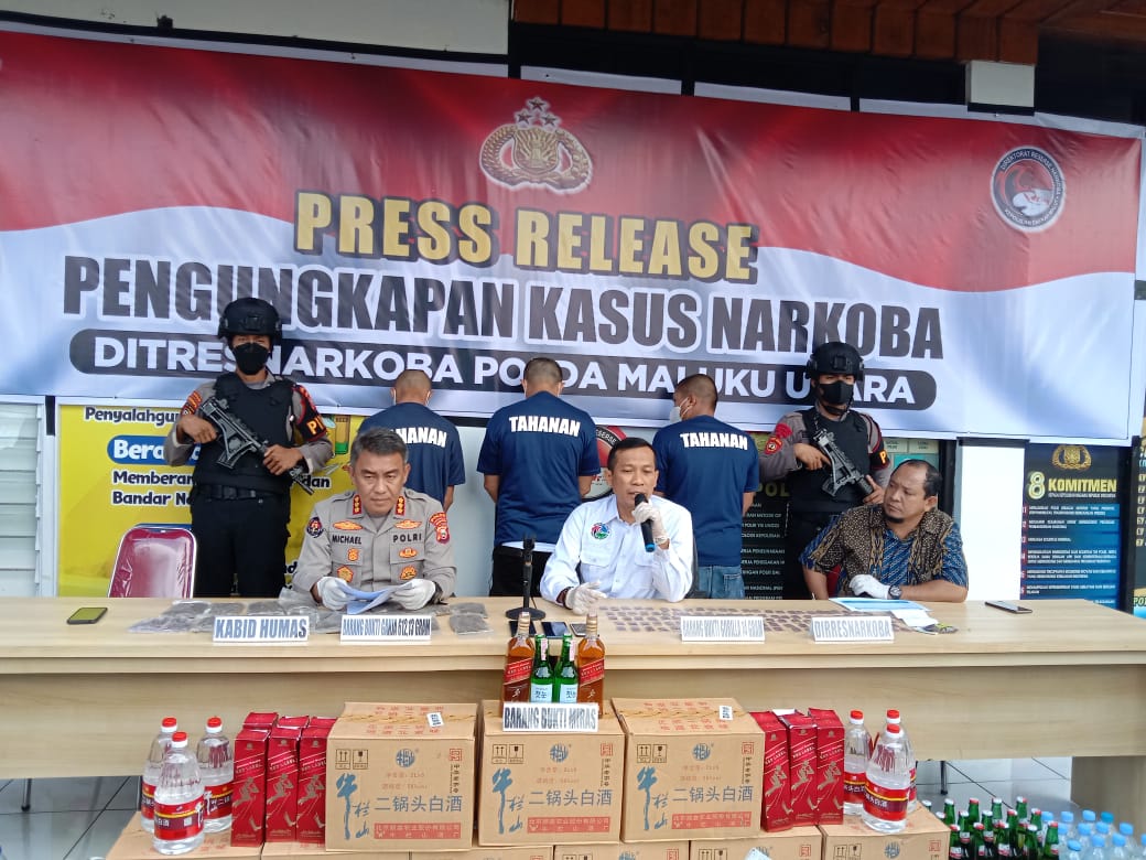 Porostimur.com, Ternate – Kepolisian Daerah (Polda) Maluku Utara (Malut), pada hari Kamis, (16/06/2022) mengelar, siar pers pengungkapan 3 orang tersangka narkoba jenis ganja 612,13, dan tembakau sintetis gorilla 14 gram.
