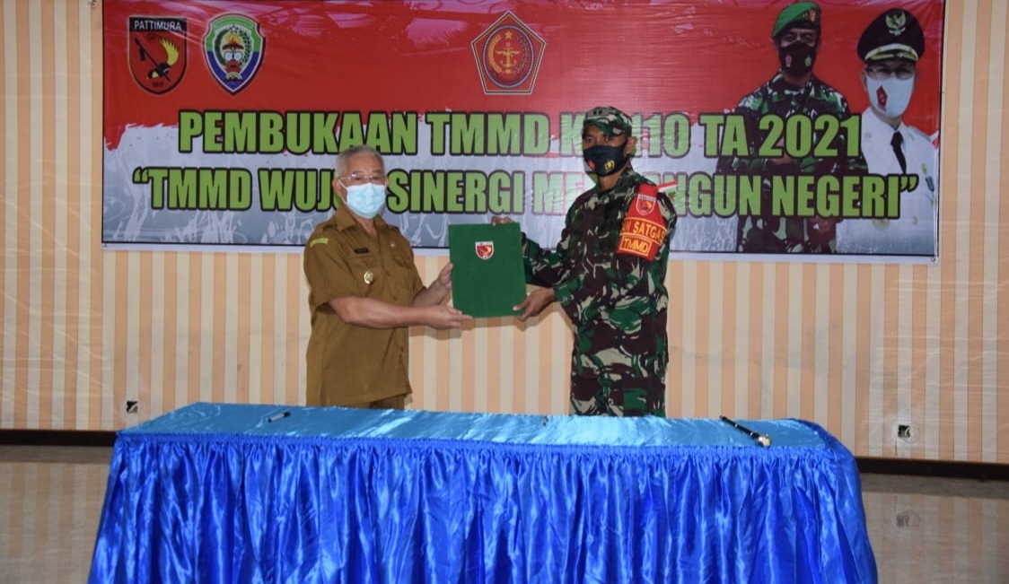 Porostimur.com | Dobo: Program Tentara Manunggal Membangun Desa (TMMD) ke-110 TA.2021 di wilayah Kodim 1503/Tual Resmi di buka secara sederhana oleh Bupati Kepulauan Aru dr. Johan Gonga di dampingi Dansatgas TMMD Letkol Inf. Mario Christian Noya bertempat di Lantai II Kantor BPKAD (Samping Kantor Bupati), Jl. Raya Pemda, Kel. Siwalima, Kec. Pulau-pulau Aru, Kab. Kepulauan Aru, Selasa (2/3/2021).
