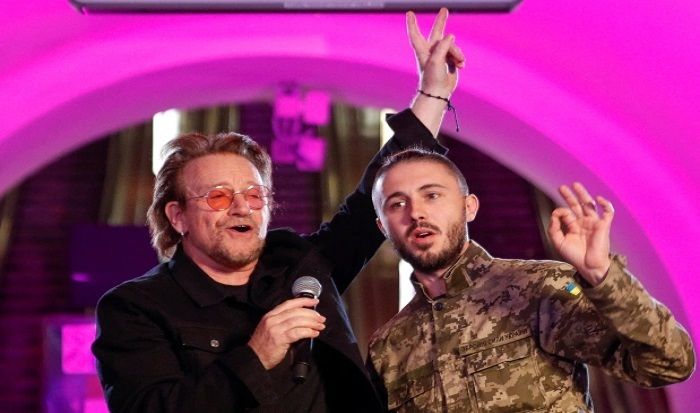 Di Kiev, Bono muncul bersama gitaris band “The Edge” menghibur sekelompok kecil penggemar termasuk anggota angkatan bersenjata Ukraina yang kelelahan.