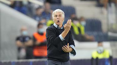 Pelatih Atalanta, Gian Piero Gasperini menginstruksikan pemainnya saat bertanding melawan Young Boys pada pertandingan grup F Liga Champions di Stadion Gewiss di Bergamo, Italia, Kamis (30/9/2021). Atalanta menang tipis atas Young Boys dengan skor 1-0. (AP Photo/Luca Bruno)