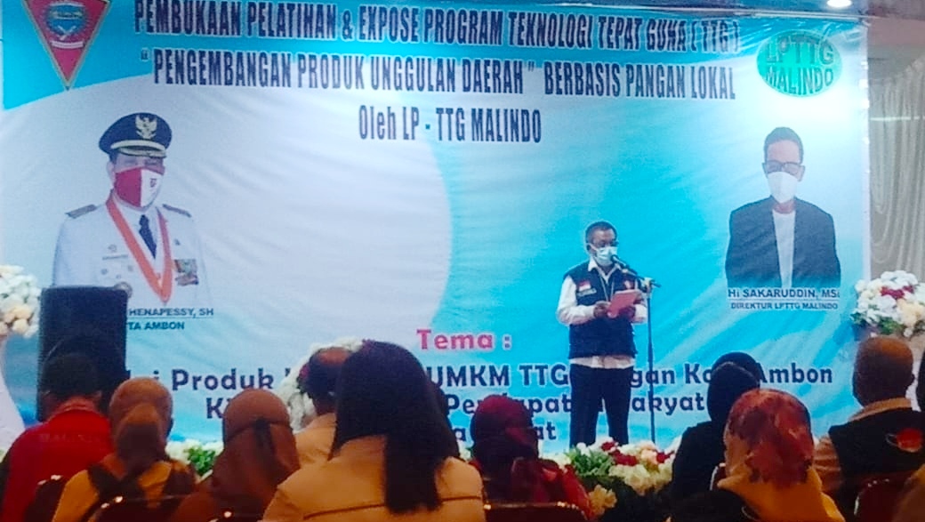 Porostimur.com | Ambon: Dinas Koperasi dan Usaha Mikro Kota Ambon bekerja sama dengan Lembaga Pengembangan-Teknologi Tepat Guna (LP-TTG) Malindo melaksanakan kegiatan “Expose Program Teknologi Tepat Guna (TTG) Pengembangan Produk Unggulan Daerah Berbasis Pangan Lokal”.