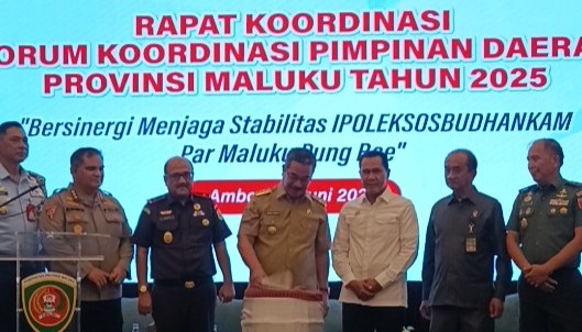 Porostimur.com, Ambon – Badan Kesatuan Bangsa dan Politik Provinsi Maluku menggelar rapat koordinasi Forum Koordinasi Pimpinan Daerah (Forkopimda),dengan tema “Bersinergi Menjaga Stabilitas Ipoleksosbudhankam, Par Maluku Pung Bae,” yang dibuka oleh Gubernur Maluku Hendrik Lewerissa, di Hotel Santika Premier Ambon,” Selasa (24/6/2025).