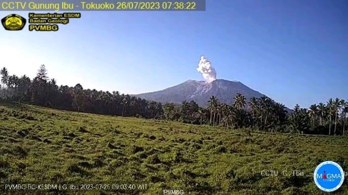 Gunung Ibu juga menyemburkan abu vulkanik pada Rabu (26/7) kemarin. Semburan abu vulkanik bergerak ke arah utara gunung.