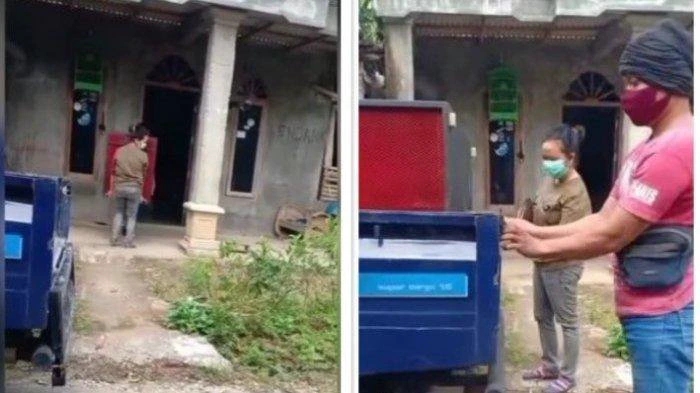 Dalam video tersebut memperlihatkan seorang wanita dan seorang pria yang mengeluarkan sound system merah dari sebuah rumah.