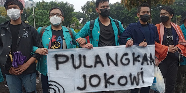 Porostimur.com – Jakarta: Mahasiswa peserta aksi melontarkan lawakan sarat kritik alias roasting terhadap Presiden Joko Widodo di atas mobil komando.