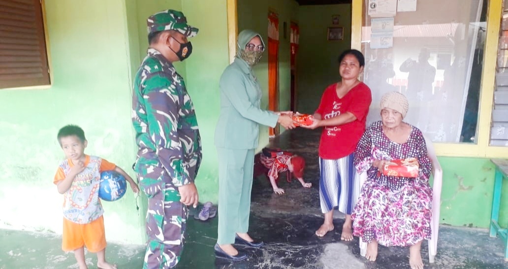 Porostimur.com | Labuha: Babinsa Koramil-03/Saketa bersama Persit KCK Ranting 4 membagikan nasi kotak untuk kaum dhuafa dan para janda di Desa Saketa dan Desa Cango, Kecamatan Gane Barat, Kabupaten Halmahera Selatan.