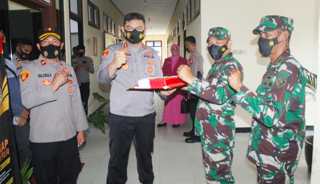 Kejutkan Polres Halsel, Kodim 1509/Labuha Berikan Kue HUT Bhayangkara Ke 75