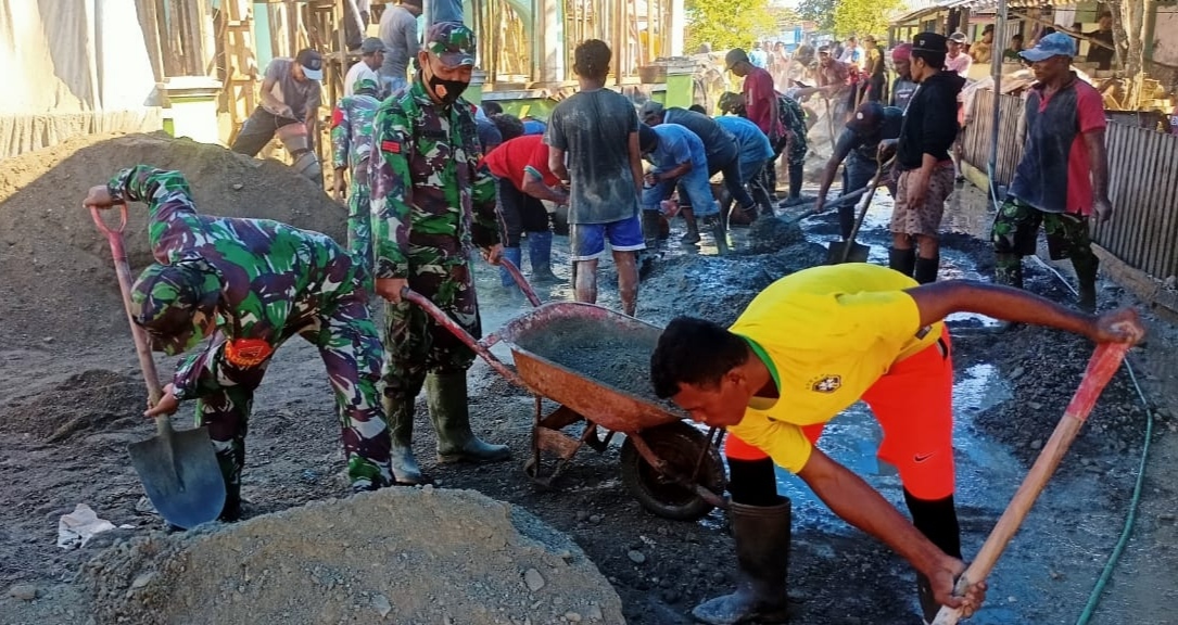 Porostimur.com | Labuha: Guna menumbuhkan perilaku gotong royong, Koramil 1509-01/Bacan bersama masyarakat melaksanakan pembangunan Masjid Baiturrahman di Desa Sawangakar, Kecamatan Botanglomang, Kabupaten Halmahera Selatan, Ahad (13/6/2021).