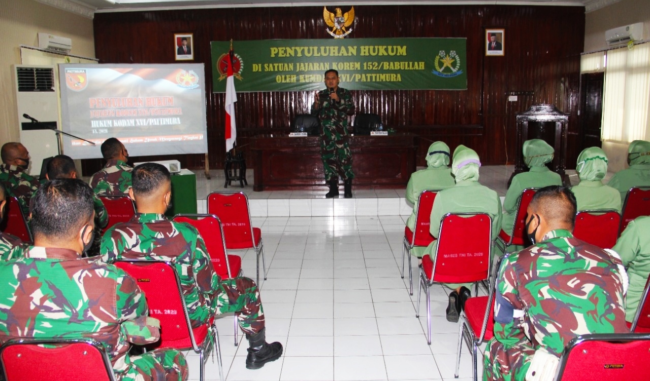 Porostimur.com | Ternate: Dalam rangka meningkatkan kesadaran hukum bagi prajuritnya, Korem 152/Baabullah melaksanakan penyuluhan hukum bagi prajurit, PNS dan Persit jajaran yang dilaksanakan di Aula Serbaguna, Makorem 152/Baabullab, Ternate, Rabu (9/6/2021).