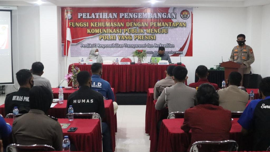 Porostimur.com – Ternate: Dalam rangka memantapkan Komunikasi Publik menuju Polri yang Presisi, Bidhumas menggelar Pelatihan fungsi Kehumasan jajaran Polda Maluku Utara yang bertempat di Hotel Grand Majang Kota Ternate, Kamis (11/11/2021).
