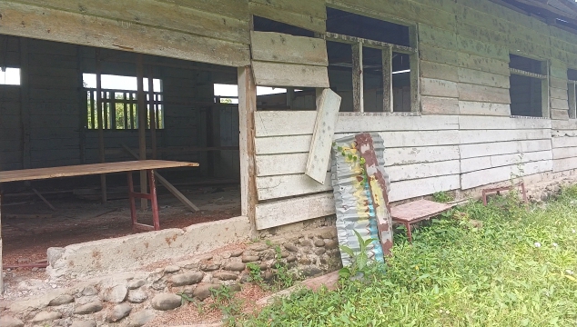 Bangunan sekolah berbahan kayu itu kini tinggal menunggu waktu. Papan-papan yang dulu melindungi anak-anak dari panas dan hujan telah lapuk dimakan usia.