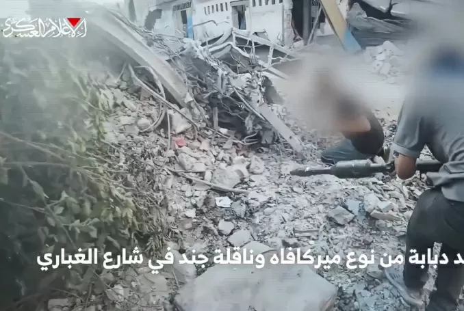 Rekaman tersebut menunjukkan tiga pejuang Al-Qassam muncul dari rumah yang hancur untuk menyerang satu tank Merkava dan satu pengangkut personel lapis baja di Jalan Al-Ghabari.