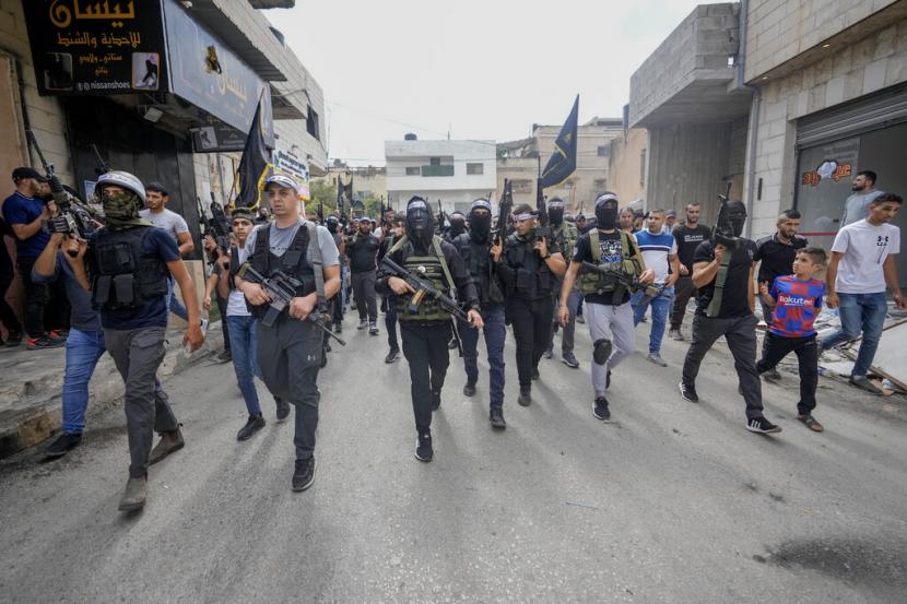 Warga Palestina bersenjata berbaris saat pemakaman Mahmoud Al-Sous, di kota Jenin, Tepi Barat, Sabtu, 10 Oktober 2018. 8, 2022. Tentara Israel menembak dan membunuh dua warga Palestina pada hari Sabtu dalam baku tembak yang meletus selama serangan militer di Tepi Barat. Militer Israel mengatakan telah menangkap seorang agen berusia 25 tahun dari kelompok militan Jihad Islam yang sebelumnya telah dipenjarakan oleh Israel. Dikatakan pria itu baru-baru ini terlibat dalam serangan penembakan terhadap tentara Israel.