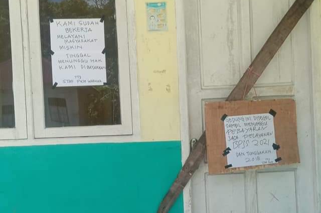 Aksi penyegelan gedung PKM itu, dipicu persoalan ketidak jelasan jasa pelayanan BPJS tahun 2020 dan 2021.