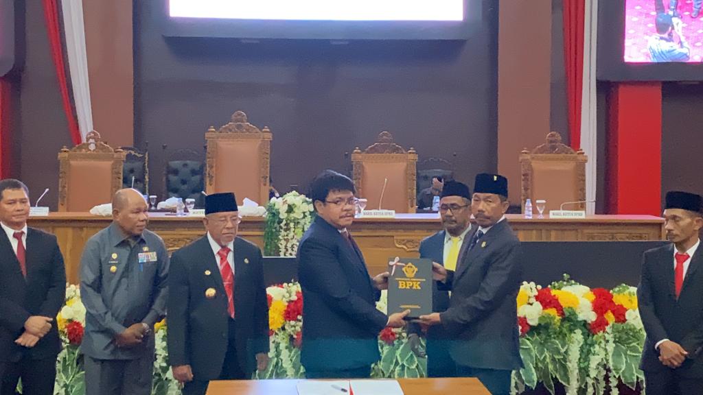 Auditor Utama Keuangan Negara VI BPK RI Laode Nusriadi saat menyerahkan dokumen laporan hasil pemeriksaan (LHP) 2022, kepada Gubernur Malut KH. Abdul Gani Kasuba di ruang paripurna DPRD, Jumat (9/6/2023) mengatakan, pemeriksaan dilakukan berdasarkan standar pemeriksaan keuangan negara (SPKN).
