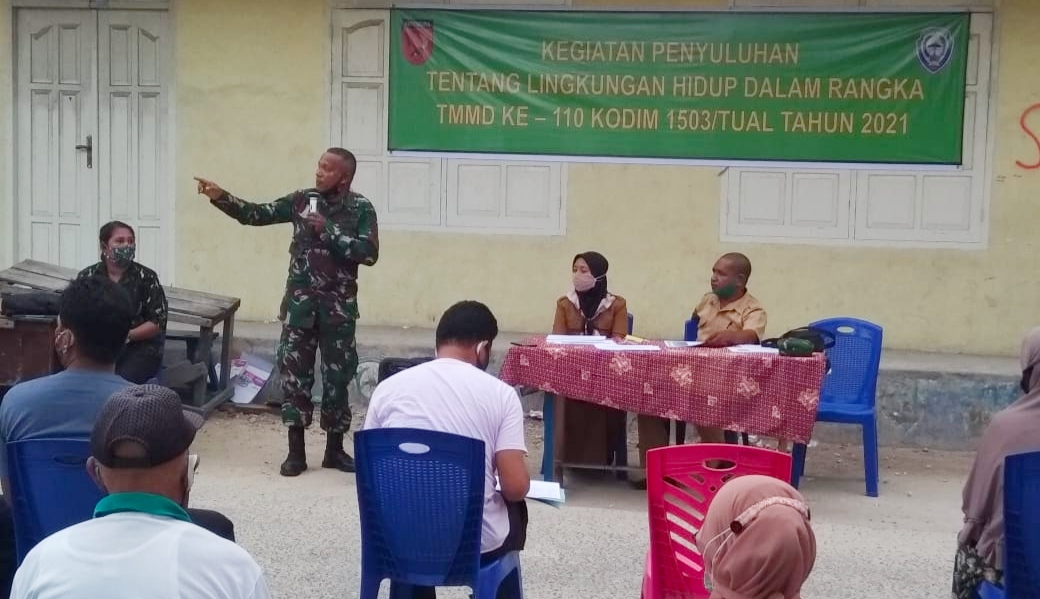Porostimur.com | Dobo: Bekerjasama dengan Badan Lingkungan Hidup (BPLH) Pemkab Kepulauan Aru, Satgas TNI Manunggal Membangun Desa (TMMD) Ke-110 Kodim 1503/Tual memberikan penyuluhan tentang Lingkungan Hidup yang berlangsung di kompleks Kampung Baru Kelurahan Siwalima tepatnya di lokasi pembangunan drainase oleh TMMD ke-110, Senin (22/3/2021)