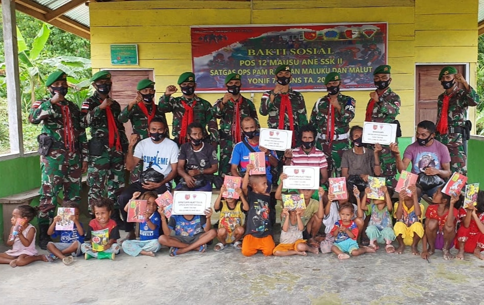 Porostimur.com | Ambon: Personel Satgas Ops Pamrahwan Maluku dan Maluku Utara Yonif 734/SNS Pos 12 Mausu Ane SSK II turut serta membantu perekonomian dan kesehatan warga suku mausu ane. Hal ini diwujudkan dengan Bhakti Sosial di Dusun Maneo, Kec. Seram Utara Timur Kobi, Kab. Maluku Tengah, Sabtu (10/4/2021).