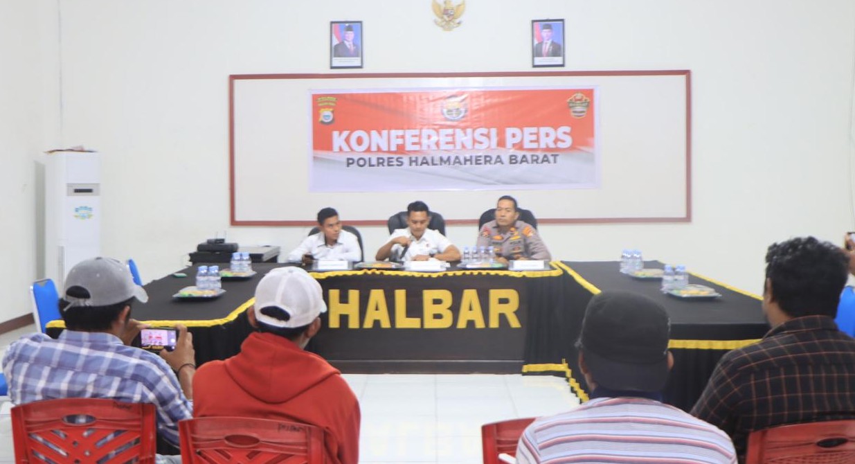 Porostimur.com, Jailolo – Polres Halmahera Barat menggelar konferensi pers terkait penanganan dan pengungkapan perkara selama tahun 2025. Kegiatan yang berlangsung di Aula Vicon Polres Halbar ini dihadiri oleh sejumlah pejabat utama, antara lain Kasat Reskrim IPTU Ikra Patamani, SH., MH., Kasi Humas IPTU Michael C. Lobiua, S.IP, Kasat Narkoba IPDA Taufik Duwila, serta insan pers dari berbagai media.