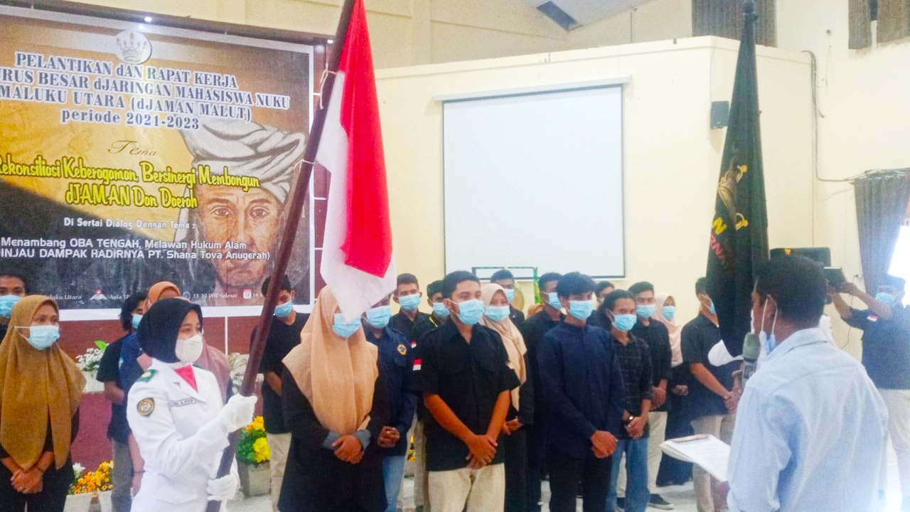 Porostimur.com | Ternate: Pelantikan pengurus besar dJaringan Mahasiswa Nuku (dJaman Malut) di asrama Haji Kelurahan Ngade, Kota Ternate berlangsung khidmat.