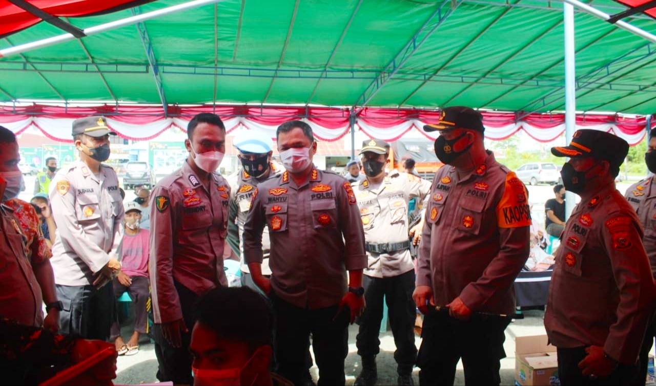 Porostimur.com – Labuha: Guna percepatan Vaksinasi Covid-19 di wilayah Kab. Halsel, Tim Asistensi Polda Malut yang dipimpin Kabid Propam Polda Malut, Kombes Pol. Wahyu Agung Jatmiko S.H., S.I.K didampingi Kapolres Halsel, Akbp. Muhammad Irvan, S.I.K dan Wakapolres Halsel, Kompol. Rusli Mangoda S.H., M.H. Meninjau langsung pelaksanaan vaksinasi massal yang dilaksanakan di Terminal Dishub Kab. Halsel, Kamis (16/09/2021).