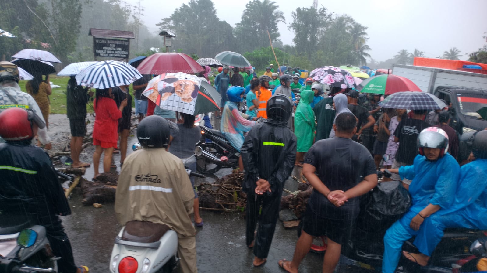 Aksi pemalangan dimulai sekitar pukul 10.00 WIT. Dengan kayu dan batu, warga menutup jalan sambil membentangkan poster-poster berisi tuntutan pembangunan talud penahan air yang telah mereka usulkan sejak tiga tahun lalu. Namun, hingga kini permintaan itu tak kunjung direspons.